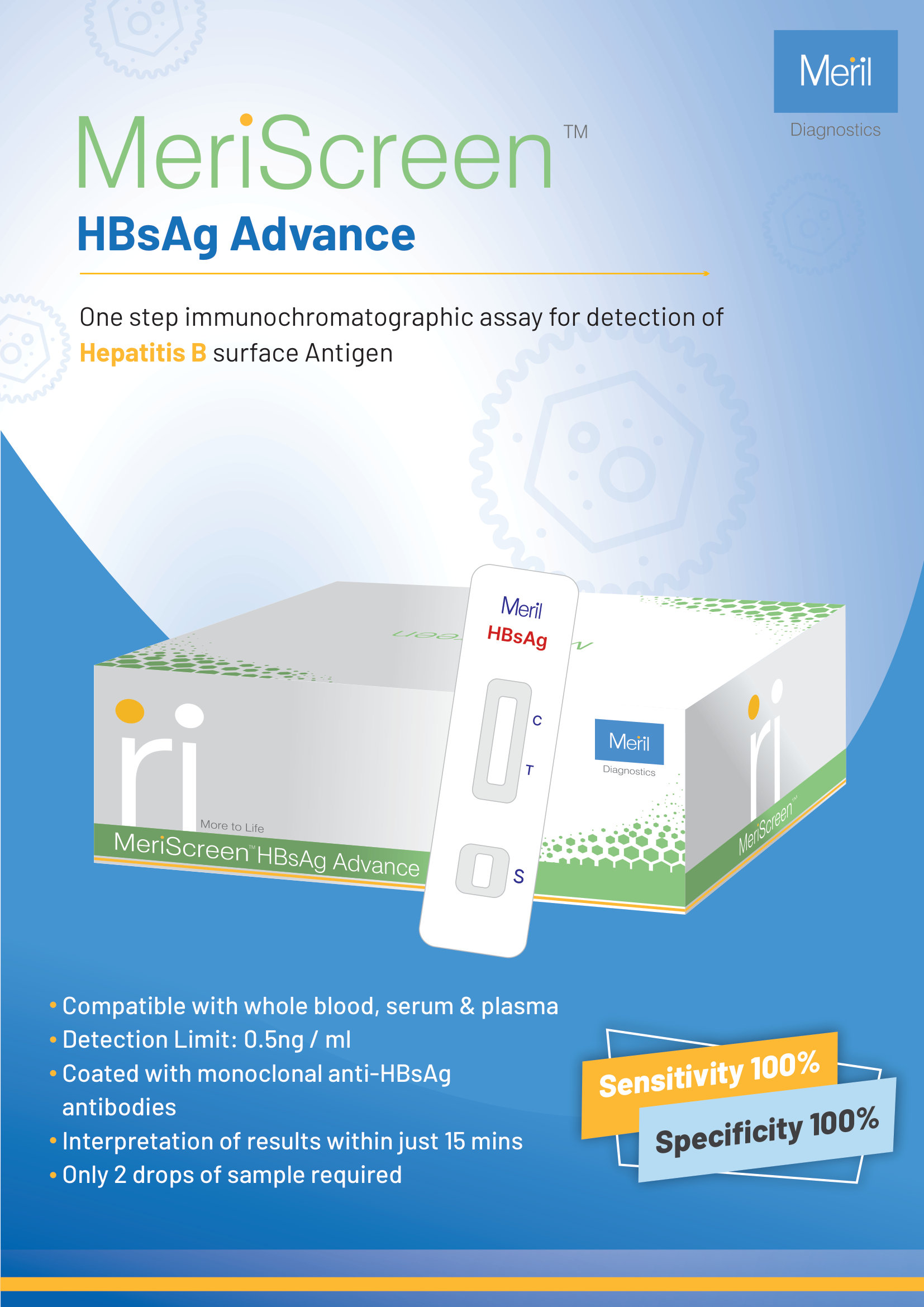 MERISCREEN HBsAg Advance is a high-precision immunochromatographic rapid diagnostic test for Hepatitis B surface antigen detection with 100% sensitivity and specificity. This point-of-care diagnostic device delivers accurate results in just 15 minutes with minimal 2-drop sample requirement, featuring monoclonal anti-HBsAg antibody coating and 0.5ng/ml detection limit. Ideal for hospital laboratories, emergency departments, and screening programs requiring reliable HBsAg testing with superior analytical performance and cost-effective hepatitis B diagnosis.