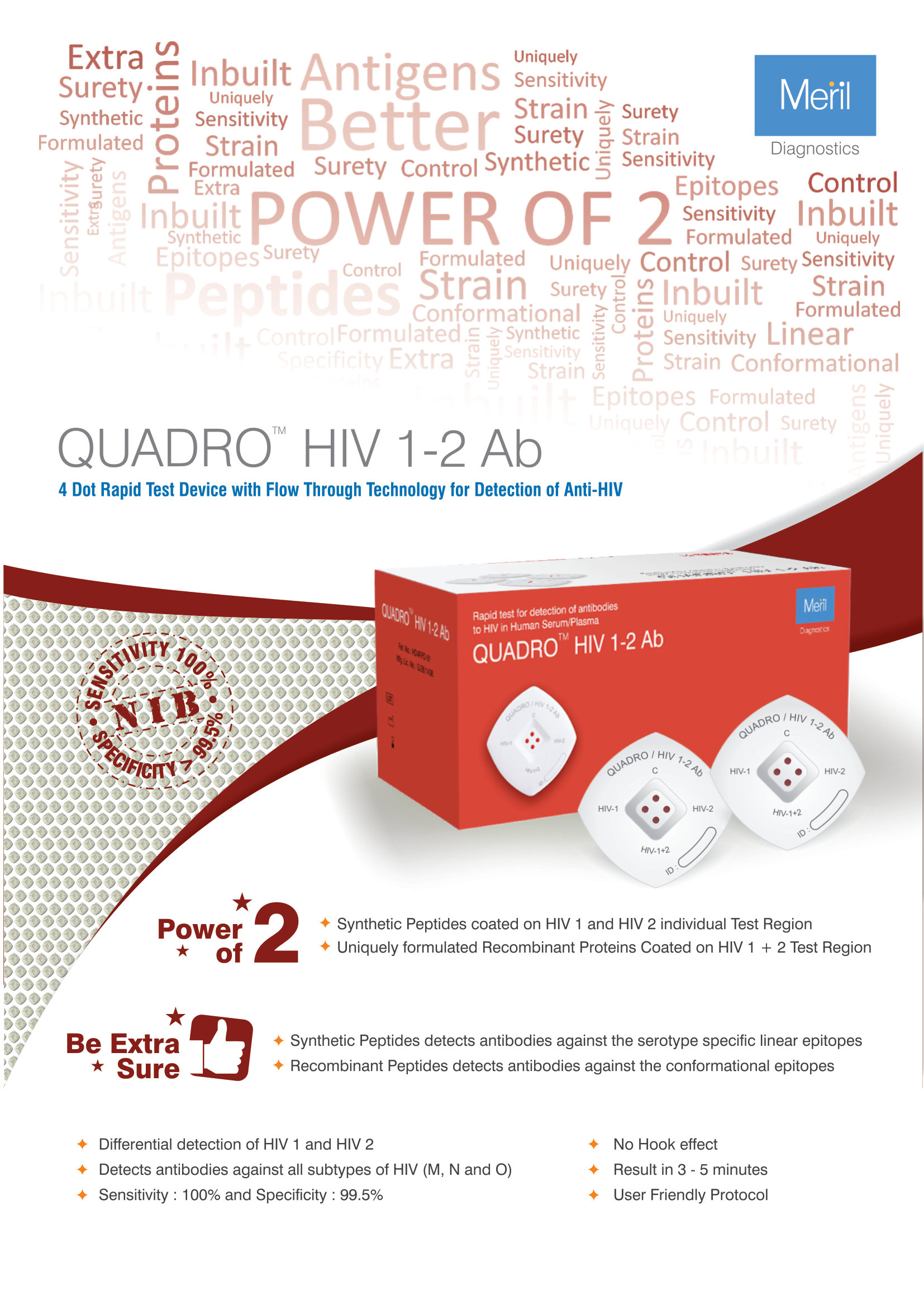 Meriscreen HIV 1-2 Ab Quadro is a WHO-prequalified rapid diagnostic test utilizing advanced immunochromatographic membrane technology for accurate HIV antibody detection. This 4-Dot Flowthrough format test provides reliable HIV-1 and HIV-2 screening results within minutes, ideal for point-of-care testing in hospitals and clinics. Room temperature storage capability ensures convenient inventory management while maintaining diagnostic accuracy and reliability for healthcare professionals.